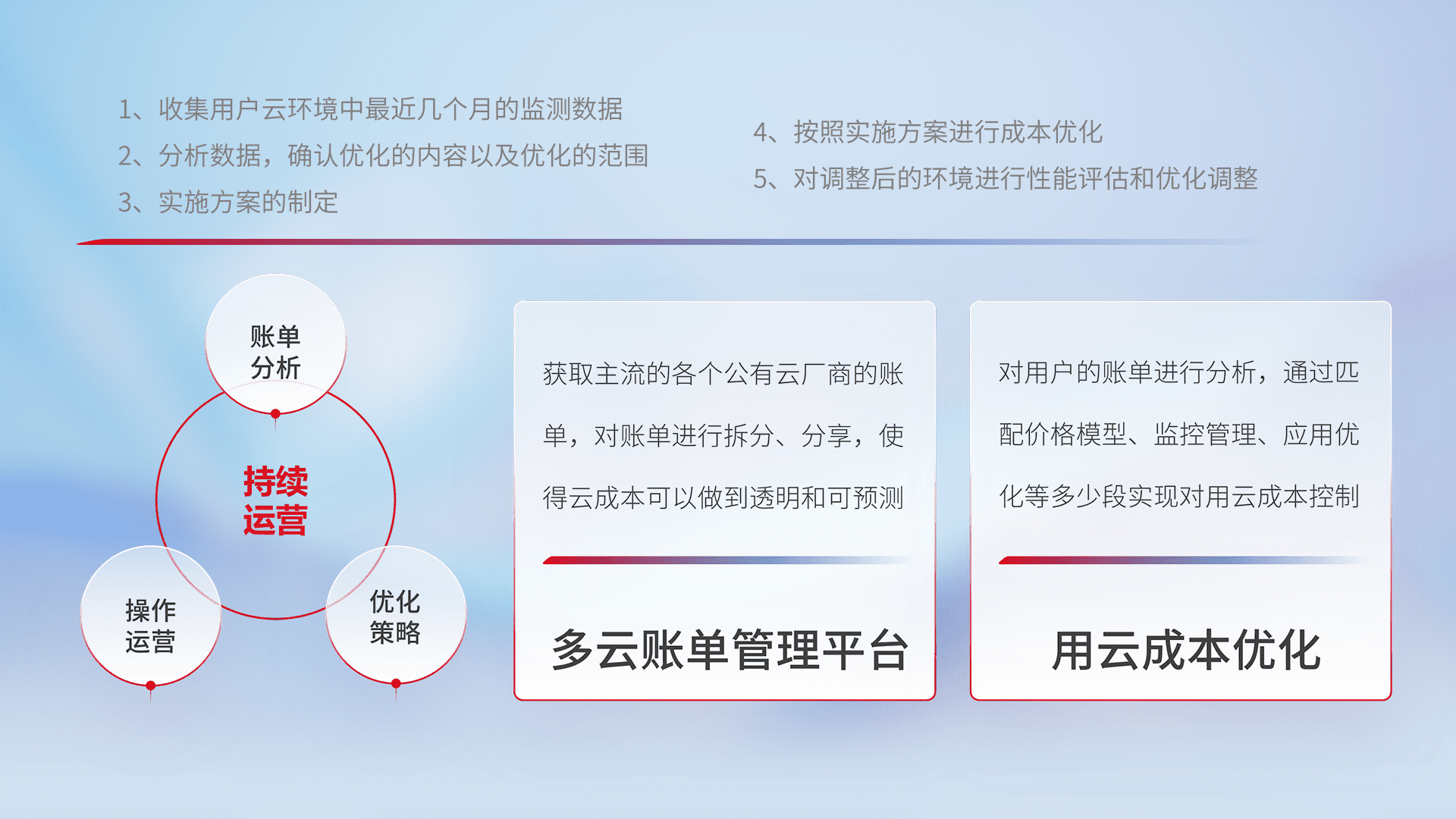 通过多云纳管,,,以统一的资源数据模型把客户的云资源进行抽象和封装,,进而实现对多云资源的统一操作,,保障云资源管理的可靠性、、、、稳定性与可用性。。。量身定制化运维内容,,,,配置、、开发运维、、、补丁管理、、、、备份、、、、监控、、、、认证和访问管理、、、、审计和日常巡检等,,保障在用云过程中的可靠度,,,稳定度以及高可用率。。。。